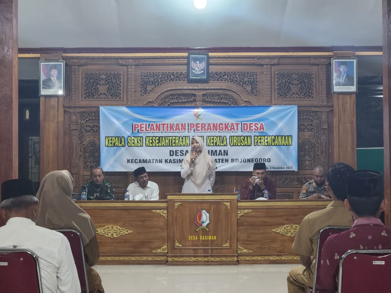 KASIMAN, Rabu (3/12/2025) — Malam ini di Balai Desa Kasiman berlangsung pelantikan resmi jabatan baru: Kepala Seksi Kesejahteraan dan Kepala Urusan Perencanaan Desa Kasiman. Acara dimulai sekitar pukul 20.00 WIB dan berjalan sampai selesai, dihadiri oleh unsur pemerintahan, aparat keamanan, serta tokoh masyarakat setempat.